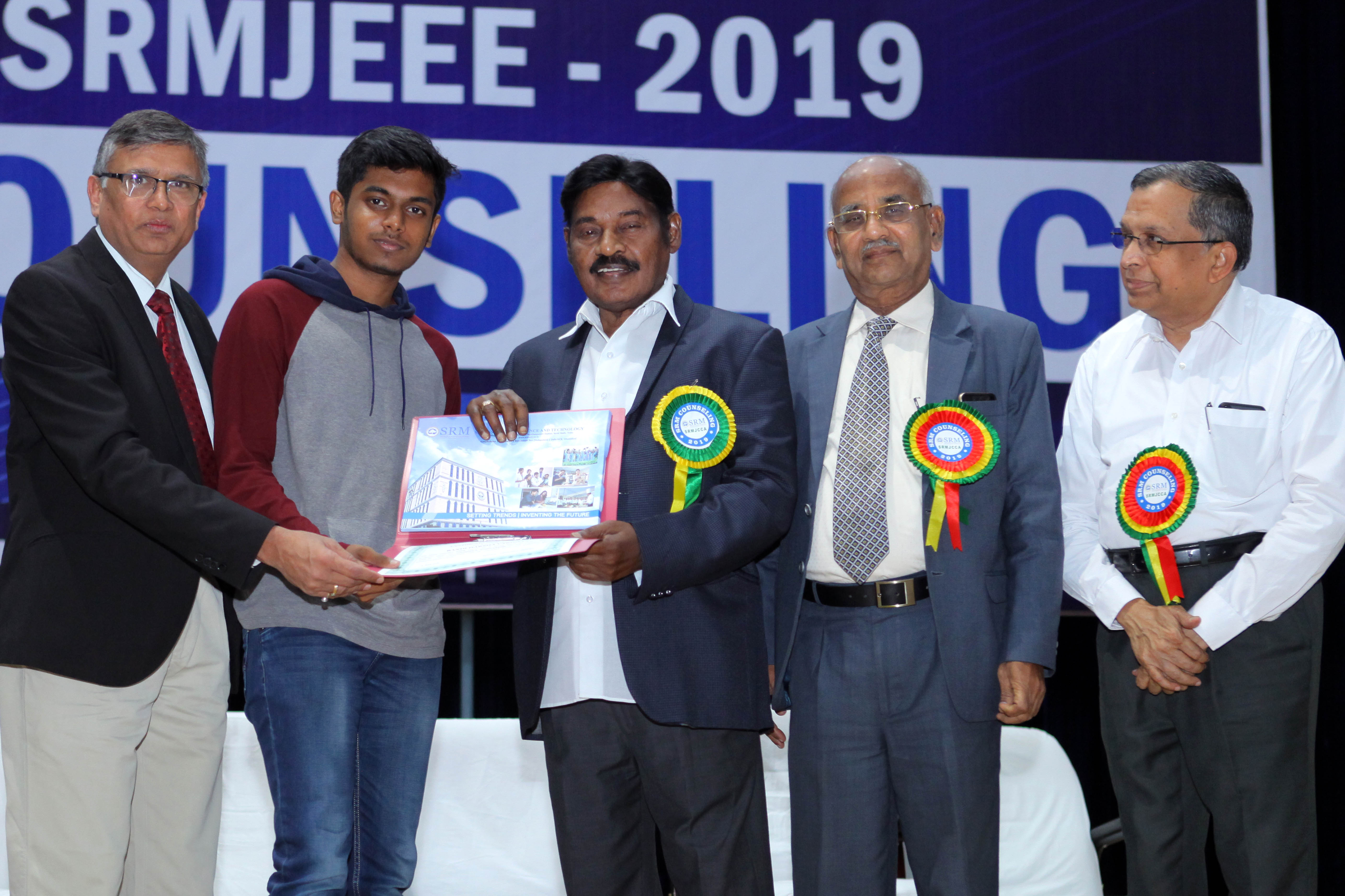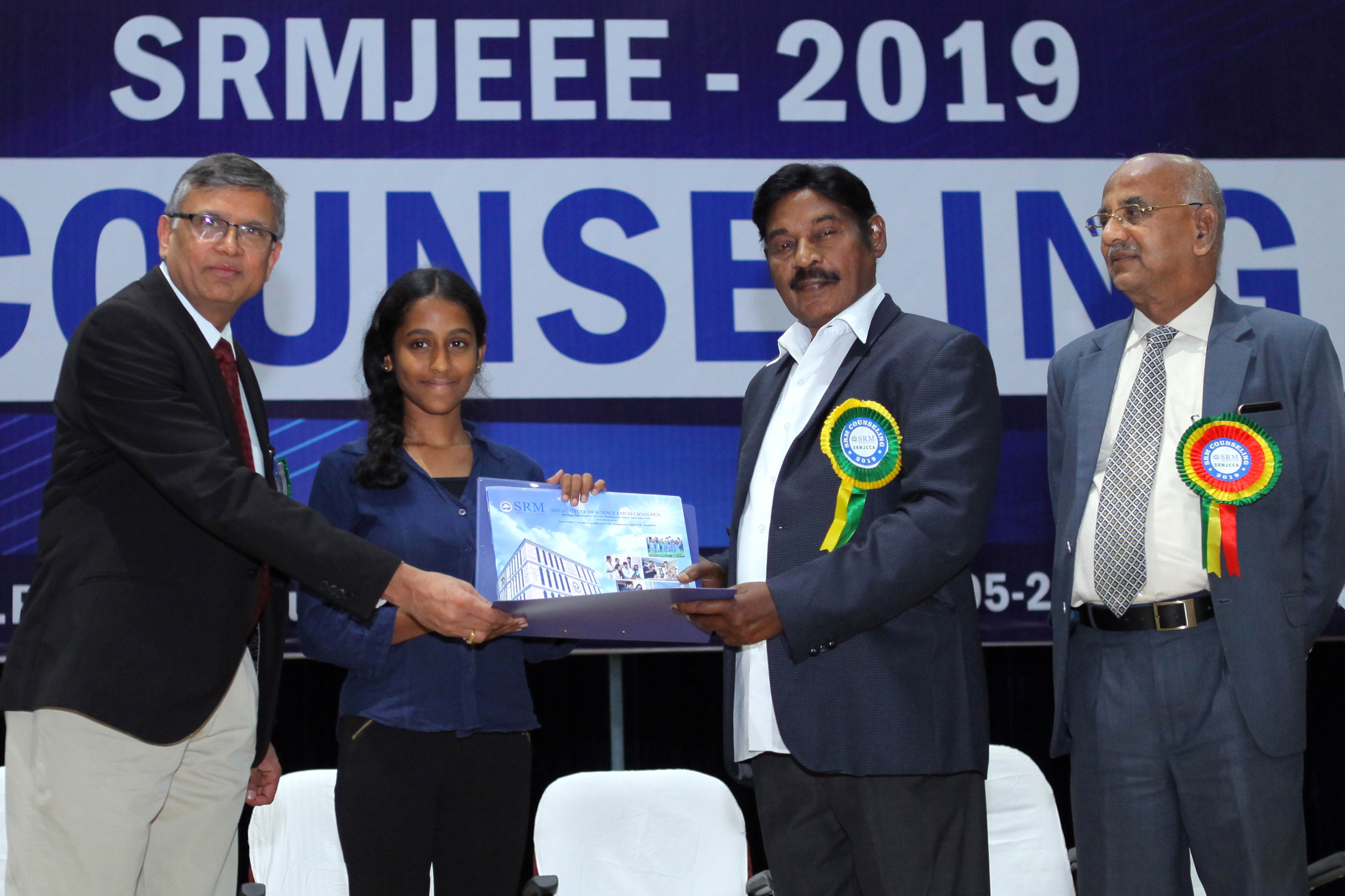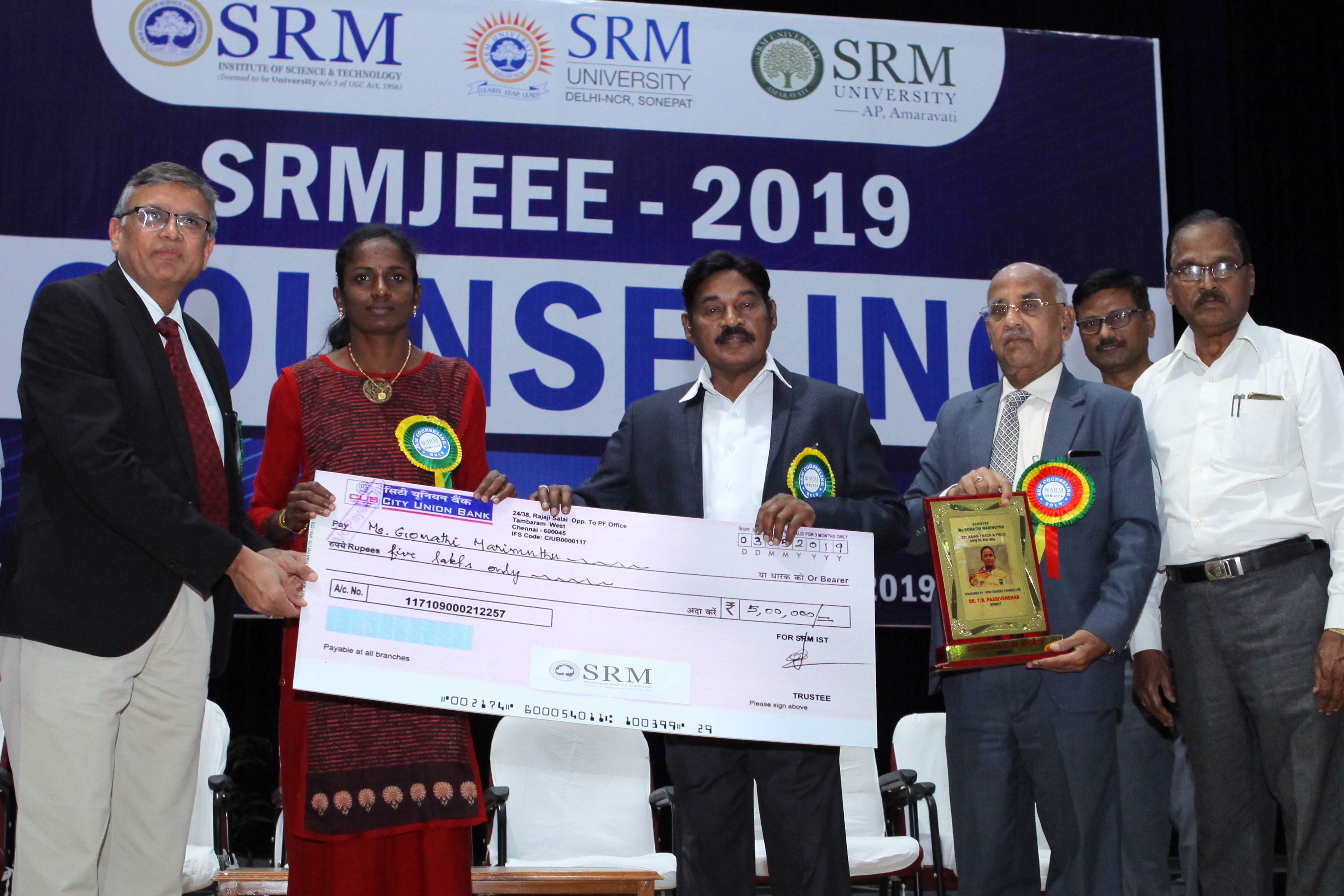 On the first day of counselling, Dr. T.R. Paarivendhar, Founder Chancellor, SRM group of institutions awarded several scholarships to recognize and reward highly meritorious students and Gomathi Mariappan who bagged gold in Asian athletic championship recently was felicitated and given a cheque of rupees 5 Lakhs for her achievement. During his address he stated that “I am very delighted to start the first day of counselling with a renowned sports personality who made India proud. I wish students to follow their passion rather sticking to one course as every courses offered at SRM will give a unique chance of growth for their future”. Prof. Sandeep Sancheti, Vice Chancellor SRMIST explained the features and progressive opportunities available at SRM for students. Prof. N. Sethuraman, Registrar and Prof. T.V. Gopal, Director Admissions, SRMIST welcomed the parents and candidates who were a part of counselling.