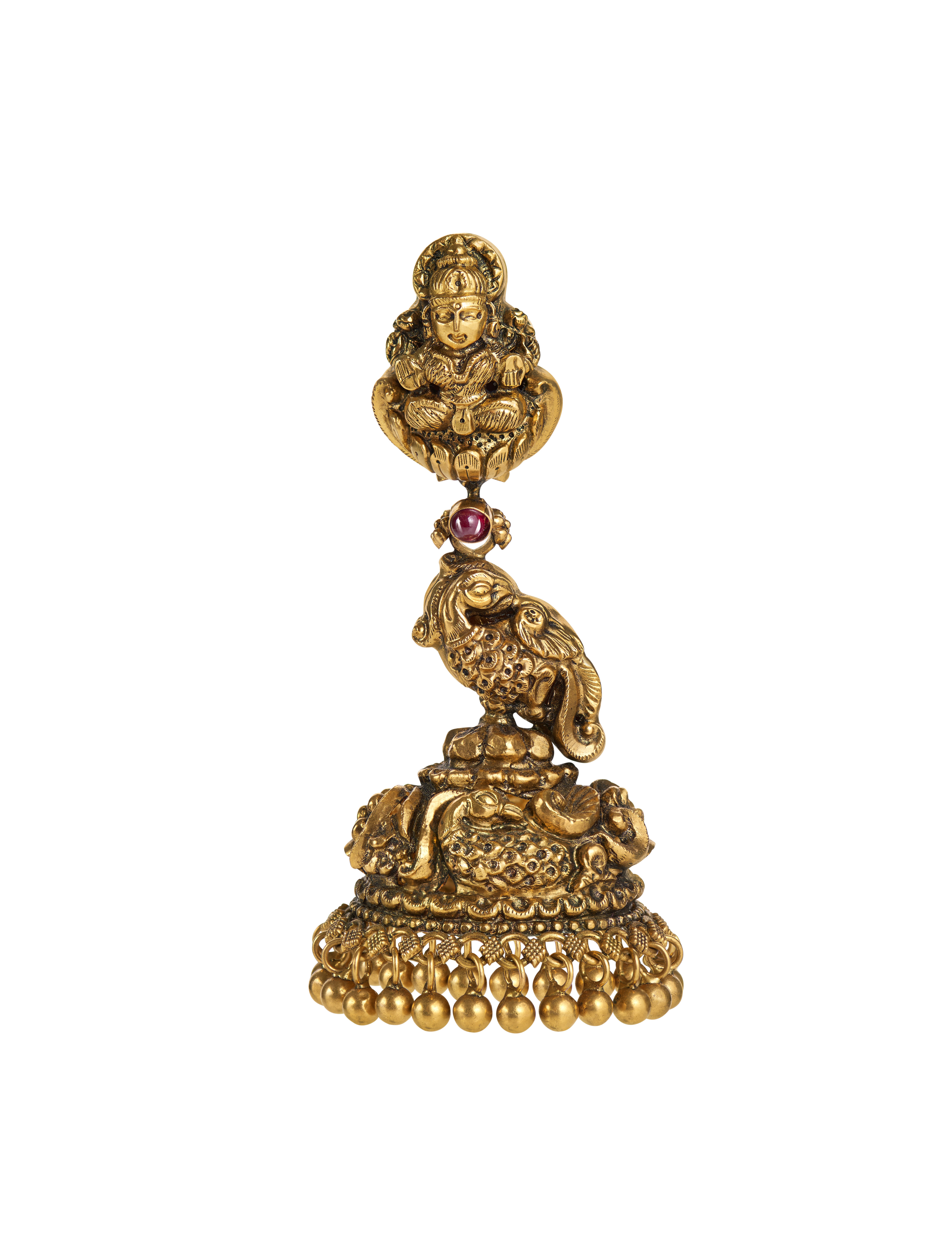One of the highlight this year are the pendants with the theme of deities – Mahalakshmi, Ganesha, Shiva, Parvathi, Krishna – in gold with antique finish as well as engraved with precious stones such as ruby, emerald and uncut diamonds.