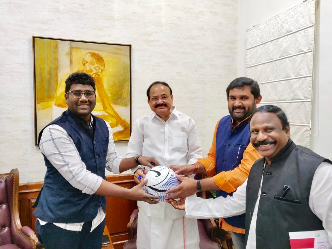 17.07.2019 அன்று துணை குடியரசு தலைவர் திரு.எம்.வெங்கய்ய நாயுடு அவர்களை சிறப்பு- ஒலிம்பிக் சர்வதேச கால்பந்து 2019 போட்டியின் குழு உறுப்பினர்கள் டாக்டர். அமர் பிரசாத் ரெட்டி (தலைவர் எஸ்.ஓ.ஐ.எஃப்.சி.), திரு. சில்வின் ஜெயக்குமார் (இவோக் மீடியா & ஹோஸ்டிங் பார்ட்னர்), டாக்டர் எம்.எஸ்.நாகராஜன் (மூத்த விளையாட்டு மேலாளர் & எஸ்.ஓ.ஏ.பி.) ஆகியோர் சந்தித்தனர், வெற்றியடையும் அணிக்கு வழங்கப்படும் கால்பந்தில், அவர் கையெழுத்து இட்டு குழு உறுப்பினர்களிடம் கொடுத்து தனது வாழ்த்துகளை தெரிவித்தார்.
