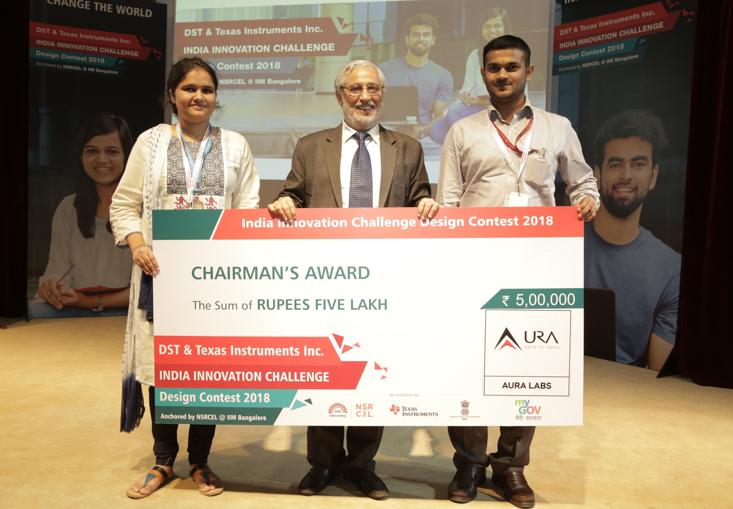 Aura Labs of SRMIST was awarded the Chairman’s Award, the First Prize at IICDC conducted by Texas Instruments India, DST India, IIMBangalore and My Gov India for the Best Innovation and Technological Impact.