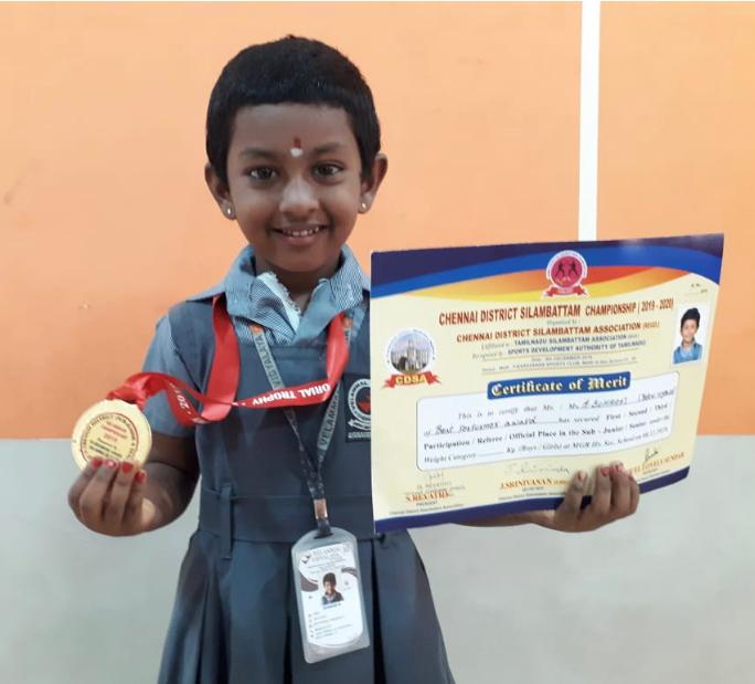 Miss. Suhaani. M, Class I of Velammal Vidyalaya (Annexure), Mel Ayanambakkam has claimed the title of BEST PERFORMER award in Chennai District Silambattam Championship in the U- 10 category organized by Chennai District Silambattam Association held at MGR Hr. Sec. School, Chennai recently. The School Management applauds her outstanding performance.