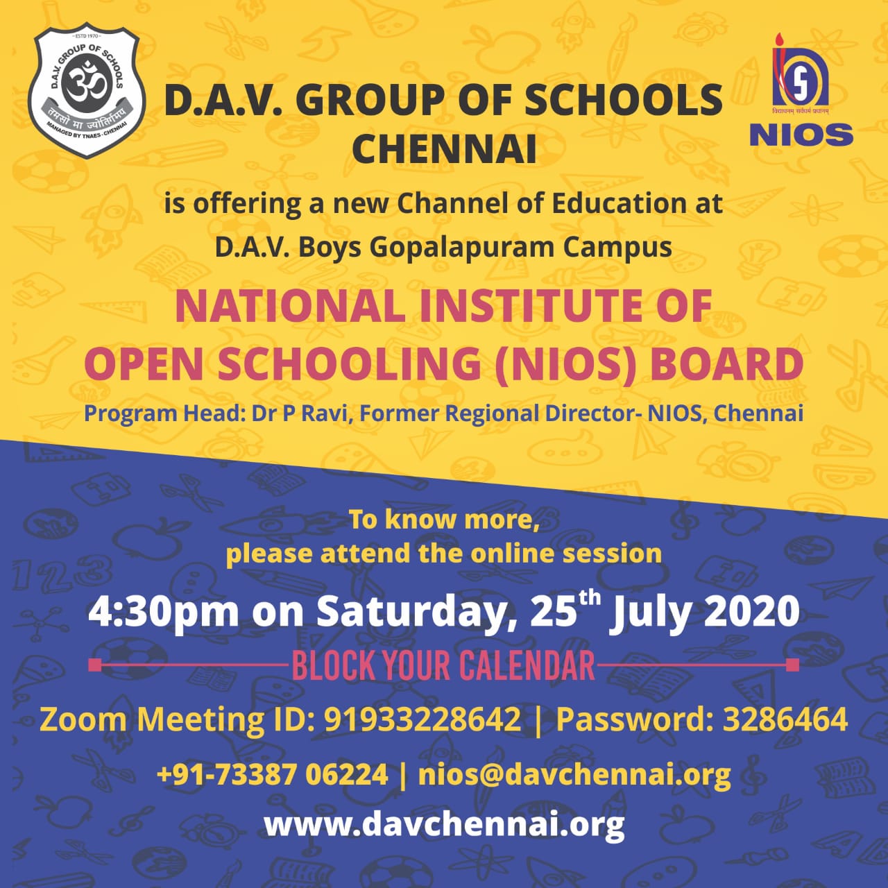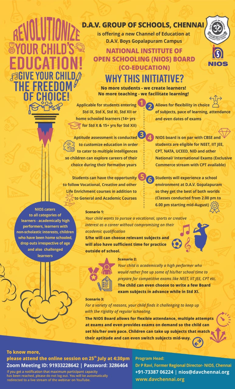 சென்னை டிஏவி பள்ளிகள் குழுமம், தேசிய திறந்த நிலைப் பள்ளிக் கல்வி நிறுவனத்தின் அங்கீகாரத்தைப் பெற்றுள்ளது: 2020 ஜூலை 25 –ல் இணைய தளம் வாயிலான தொடக்க நிகழ்ச்சி நடைபெறுகிறது
