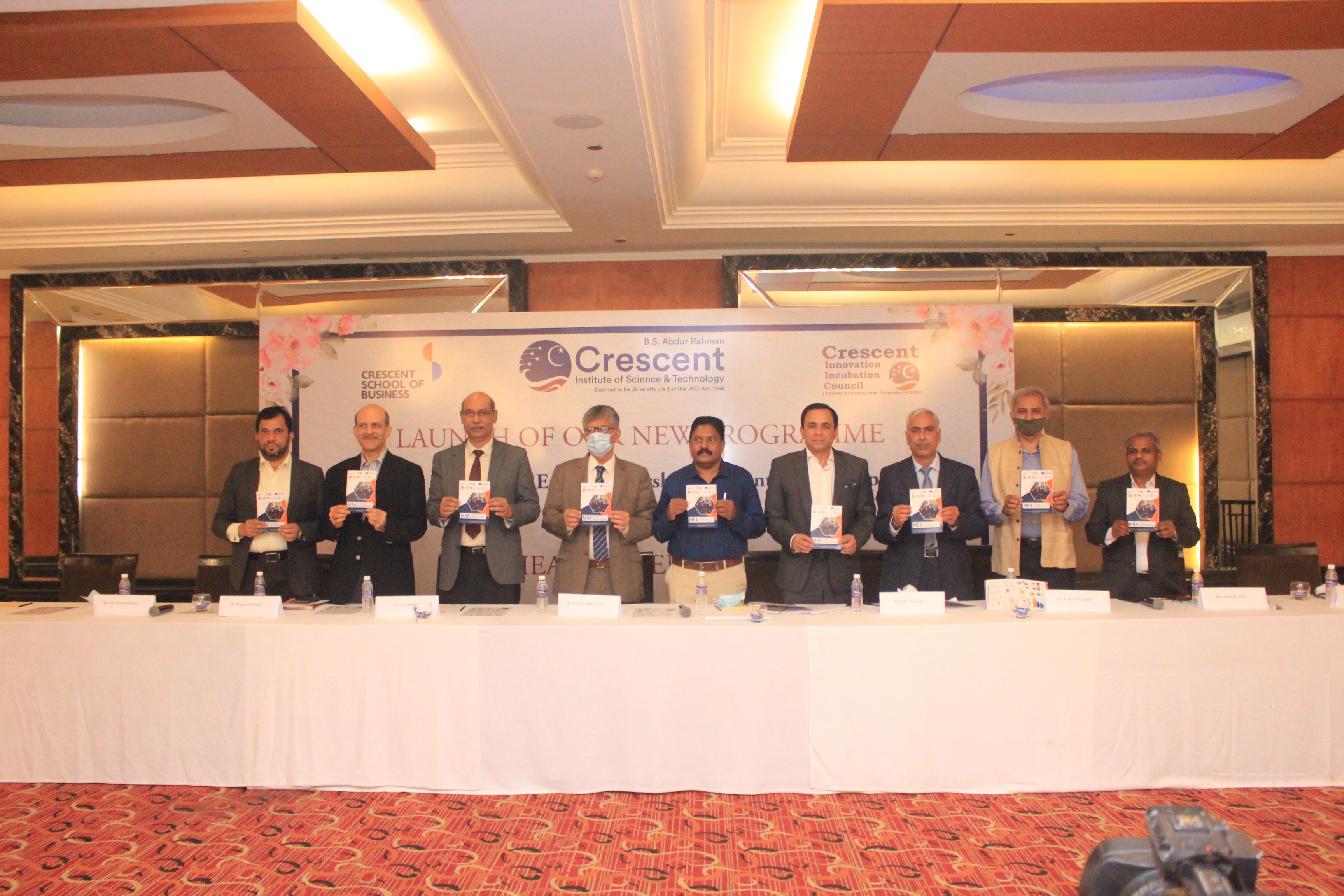 Dignitaries during the Launch of MBA – Innovation, Entrepreneurship and Venture Development – Mr. Parvez Alam, CEO & Director, CIIC; Mr. Rajan Srikanth, President, Keiretsu Forum – Chennai; Dr. A. Azad. Registrar, BSACIST; Dr. A. Peer Mohamed, Vice Chancellor, BSACIST; Mr. Sivarajah Ramanathan, Founder & CEO, Nativelead; Mr, Reji Joseph, Advisor Investor; Dr. Raja Hussain, Additional Registrar, BSACIST; Mr. Chandu Nair, Start-Up Advisor; Dr. K Srinivasan, Dean, Crescent School of Business.