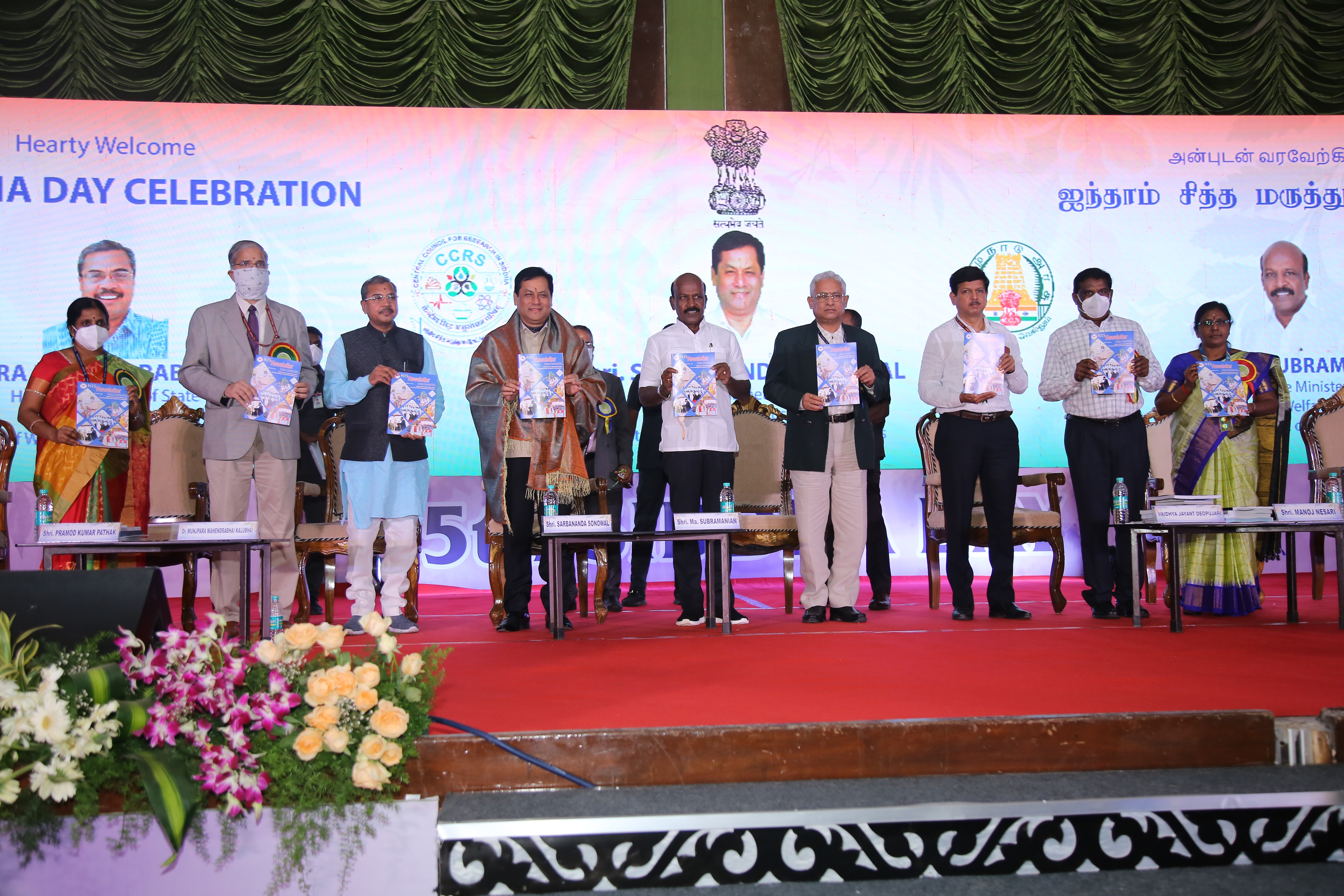 (From Left) Prof. Dr. K. Kanakavalli, Director General, CCRS, Shri Pramod Kumar Pathak, Special Secretary, Ministry of Ayush, Dr. Munjpara Mahendrabhai Kalubhai, Honorable Minister of State, Ministry of Ayush and Ministry of Women and Child Development, Shri Sarbananda Sonowal, Honourable Cabinet Minister, Ministry of Ayush & Ministry of Ports, Shipping and Waterways, Shri. Maa. Subramanian, Honourable Minister of Health & Family Welfare Development, Government of Tamil Nadu, Mr. Jayant Yeshwant Deopujari, Chairman, NCIM, Dr. Manoj Nesari, Advisor Ayurveda, Shri. S. Ganesh, Director, Directorate of Indian Medicine & Homeopathy, Government of Tamil Nadu, Prof. Dr. Meenakumari, Director, NIS