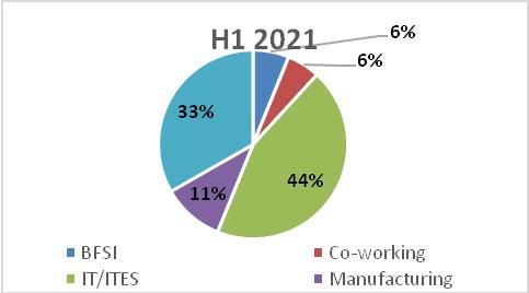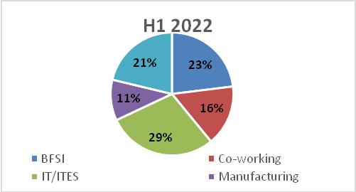 • IT sectoraccounts for 29% of the total area transacted during H1 2022; BFSI at 23%