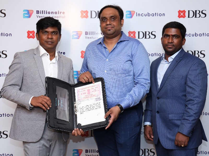 The Chennai based Billionaire Venture Incubation and DBS Bank are signing an MoU today to facilitate investment in the fast-growing startups in India through a Special Purpose Vehicle (SPV) formed by this joint venture in the form of equity.