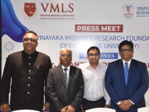 (Left to Right)- Prof. Dr.C.Raj Kumar, Founding Vice-Chancellor, O P Jindal Global University, Dr.A.Francis Antony Julian, Senior Advocate, Supreme Court of India and Chairperson , Joint Implementation Committee (JIC), Aarupadai Veedu Institute of Law(AVIL), Vinayaka Mission’s Research Foundation, Dr.Ananth Padmanabhan, Dean, Aarupadai Veedu Institute of Law(AVIL), Vinayaka Mission’s Research Foundation, Mr.J.Suresh Samuel, Member, Board of Management, Vinayaka Mission’s Research Foundation