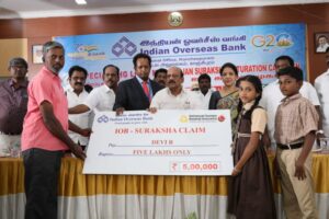 IOB Suraksha, with its comprehensive coverage against accidental death, injury, and permanent disability, proved to be a vital protection during this challenging time. Families of four deceased workers who were covered under the policy received claim settlement cheques of ₹10 lakhs In a heartfelt ceremony organized by Indian Overseas Bank recently, Mr. Ajay Kumar Srivastava, MD & CEO of Indian Overseas Bank & Shri. T.M. Anbarasan, Tamil Nadu State Minister for Rural Industries presided over the event, symbolizing the shared commitment to the safety and well-being of employees and factory workers.