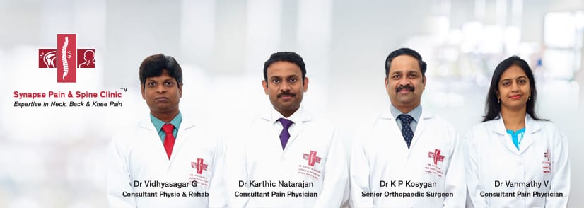 Synapse Pain and Spine Clinic is a renowned Spine and Joint Pain Clinic in Besant Nagar, Chennai. The clinic specialises in Spine – Back and Neck Pain, Joint – Knee, shoulder & ankle pain and sports injuries. The clinic is run by well known Spine & Pain Physicians, Dr Karthic Natarajan and Dr Vanmathy V who are specialists in non-surgical treatments. They provide treatments for spine problems, disc herniations, sciatica, neck and shoulder pain, knee arthritis and other spine and nerve problems, without surgery.