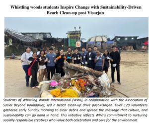 Students of Whistling Woods International (WWI), in collaboration with the Association of Social Beyond Boundaries, led a beach clean-up drive post-visarjan. Over 120 volunteers gathered early Sunday morning to clear debris and spread the message that culture, and sustainability can go hand in hand. This initiative reflects WWI’s commitment to nurturing socially responsible creatives who value both celebration and care for the environment.